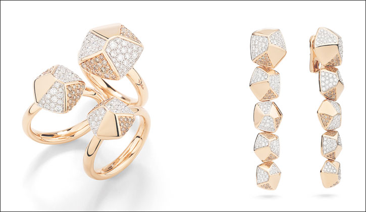 Pomellato unveils Pentagoni, a groundbreaking High Jewelry collection that heralds a new era of creative audacity. Drawing inspiration from geometry, this collection reinterprets the pentagon shape through a contemporary lens, enriching each piece with white and brown diamonds. The dynamic composition of pentagon shapes creates a sense of movement, bringing each creation to life. The collection’s powerful aesthetic represents a masterfulfusion of Pomellato’s signature boldness with sophisticated diamond setting techniques, elevating geometric forms into modern sculptural masterpieces. A Celebration of Craftsmanship Pentagoni’s rose gold framework is a tribute to Pomellato’s goldsmithingheritage. The design reimagines geometric principles through pentagons of varying scales, each set at different angles to achieve a bold, three-dimensional effect. Our artisans work with a special rose gold alloy, exclusive to the Maison, that brings warmth and luminosity to each creation. This precious metal is shaped and polished to achieve a perfect balance between strength and delicacy. A Distinctive Approach to Diamonds At Casa Pomellato, each Pentagoni piece undergoes a remarkable journey of creation. Expert hands carefully position every diamond, conscious that each stone’s placement affects the overall harmony of the design. The design alternates between diamond-set surfaces with our signature irregular pavé technique and polished rose gold facets, creating a playful and seductive interplay of materials. This setting allows each gem to catch and reflect light in unexpected ways. The Pentagoni collection unfolds through a harmonious array of statement pieces. The necklace stands as the collection’s masterpiece, where pentagons of varying dimensions create a mesmerizing cascade around the neck. Contemporary pendant earrings echo the collection’s bold aesthetic, while a trio of rings invites creative expression through versatile styling options. This collection represents the pinnacle of Pomellato’s jewelry-making expertise, where High Jewelry craftsmanship meets innovative design. Each piece speaks the language of contemporary jewelry while preserving traditional artisanal skills, creating tomorrow’s treasures through today’s masterful hands.
