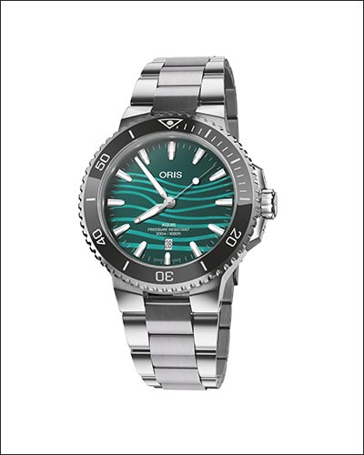 Yangtze Jiangtun Limited Edition This 43.5 mm Aquis Date celebrates the critically endangered Yangtze finless porpoise, featuring a blue-green mother-of-pearl dial with a wave pattern inspired by the porpoise’s river habitat. Crafted in stainless steel, the watch combines Oris’s automatic Calibre 733 movement with subtle design details that honour the rare species and support ongoing conservation efforts.