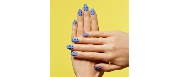 GINGHAM & (SURPRISE!) NEGATIVE SPACE 'For this look, you need the perfect translucent backdrop—I used Sally Hansen Double Duty Base & Top Coat. And then you actually need two different shades of any color, one lighter and one darker, to give the illusion that a sheer crosshatching is being overlapped. I used two Sally Hansen Miracle Gel colors, as the lighter color, “Hydro Electric”, and a deeper blue called 'Tidal Wave‘ and I finished the look with Sally Hansen Miracle Gel Top Coat'