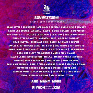 Hosted in Riyadh between December 16-19, SOUNDSTORM will feature a world-leading international music line-up with more than 150 global superstar headliners and international dance acts performing alongside local and regional talent. Electrifying over 500,000 revellers at what is one of the region’s most unique entertainment experiences will be international artists Armin Van Buuren, David Guetta, Deadmau5, DJ Snake, Eric Prydz, Martin Garrix, Paul Kalkbrenner, Tiësto, and Steve Aoki, in addition to Adam Beyer, Amelie Lens, Carl Cox, Charlotte de Witte, Jeff Mills, Nina Kraviz, Sven Väth as well as homegrown regional artists including Anmarz, Cosmicat, Spaceboi, and Zone+ with many more announced in the countdown to the festival. Talal Albahiti, COO and Head of Talent Booking, said: “We’re happy with the first announcement of the SOUNDSTORM ‘21 line up. We will soon announce a second phase which includes a wide variety of musical genres that will take attendees on a journey they won’t forget. We are ready to welcome all music enthusiasts to become part of this immersive 4-day experience.” Tickets are now available to purchase online through mdlbeast.com and in-store at Virgin Megastores in Saudi Arabia with Second Release tickets exceeding all expectations. SOUNDSTORM offers its attendees day passes as well as 4-day passes with four tiers to choose from: Storm Chaser; Storm Blazer; VIB and VIB-BOX. Each tier offers something different. The most basic festival access with a shuttle service from select locations in Riyadh is at SAR 135 per day, while exclusive VIP experience (VIB - our very important beasts), day tickets are available for SAR 2,999. First Release tickets have now sold out. From today, however, Second Release tickets are 15% off full price for 4-day passes. Ramadan Alharatani, CEO, highlighted the company’s efforts to ensure the health and safety of the attendees and delivering a festival like no other, “Our vision is to deliver a unique and positive experience for hundreds of thousands of people as they enjoy some of the world’s biggest stars performing in front of a passionate Saudi audience. We are undertaking comprehensive measures around COVID to ensure our guests have the best and safest possible experience, all in partnership with local entertainment and health regulators. Furthermore, we have developed and released a code of conduct which ticket-buyers sign and are expected to abide by in order to ensure a safe space for everyone. Further details will be announced in due course”
